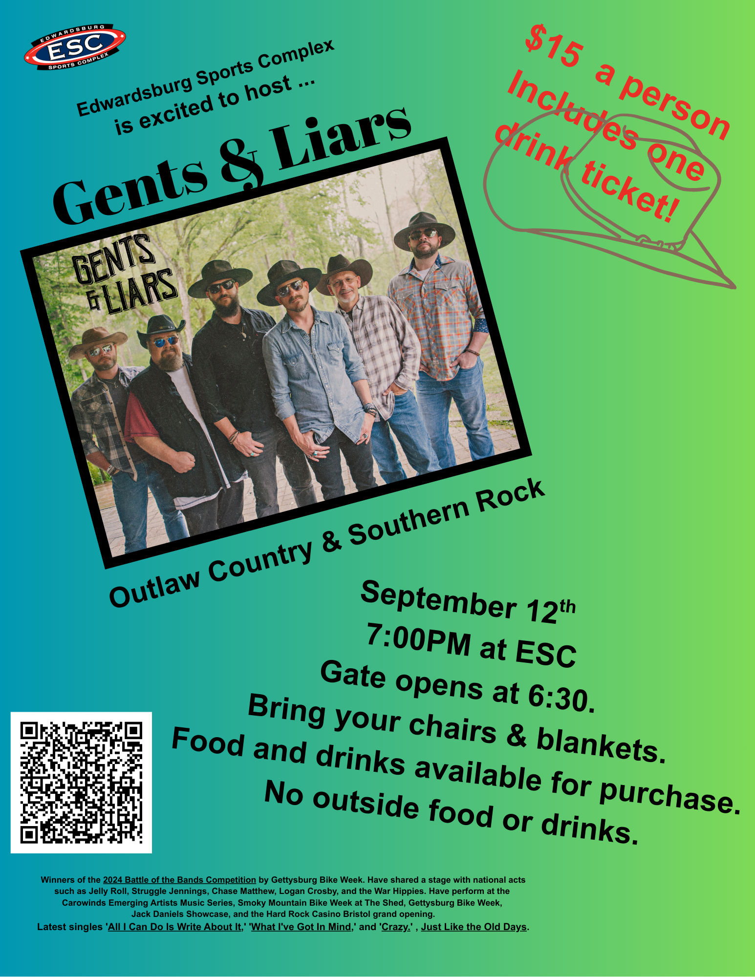 The Gents & Liars are a dynamic six-piece band washed in outlaw country and southern rock. For nearly a decade, these artists have been crafting first-class harmonies and a comprehensive catalog of original songs. The Gents & Liars are the winners of the 2024 Battle of the Bands Competition by Gettysburg Bike Week and are proud to have shared a stage with national acts such as Jelly Roll, Struggle Jennings, Chase Matthew, Logan Crosby, and the War Hippies. In addition to selling out local venues, the Gents & Liars have been invited to perform at the Carowinds Emerging Artists Music Series, Smoky Mountain Bike Week at The Shed, Gettysburg Bike Week, Jack Daniels Showcase, and the Hard Rock Casino Bristol grand opening.https://www.youtube.com/watch?v=ZJCm0AAqLi4